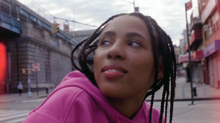 Before long the image transitions back to exterior skating on the streets, the image is blurred and relaxed. The sounds and pacing of the edit reflect the vibe. We follow Alexis’s movement, skating alongside them. A wide shot shows Alexis and her friends skating away from the camera down the street. In the distance, beyond our talent, a shoe the size of a double-decker bus sits at a street corner as if stopped at the intersection.